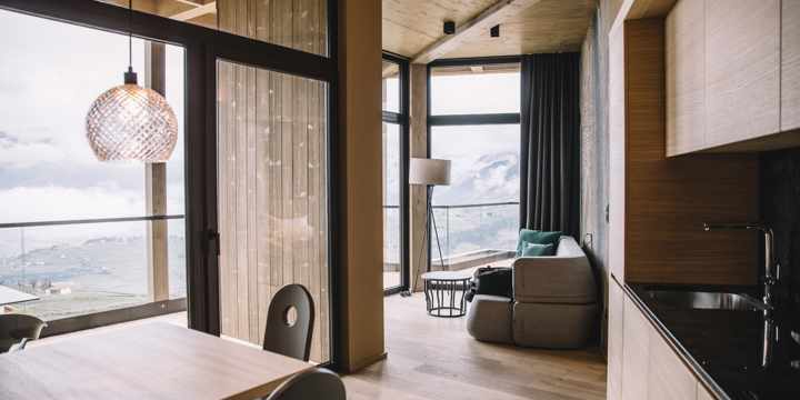Panorama a 360°, la meraviglia di una sconfinata vista circolare. Due balconi circondano la suite Sky Deluxe. Così vi godrete il cammino del sole dai primi raggi mattutini fino al tramonto con i suoi colori vivaci. Grandi vetrate riempiono di luce e leggerezza questi ambienti di design. Bello sentirsi bene.